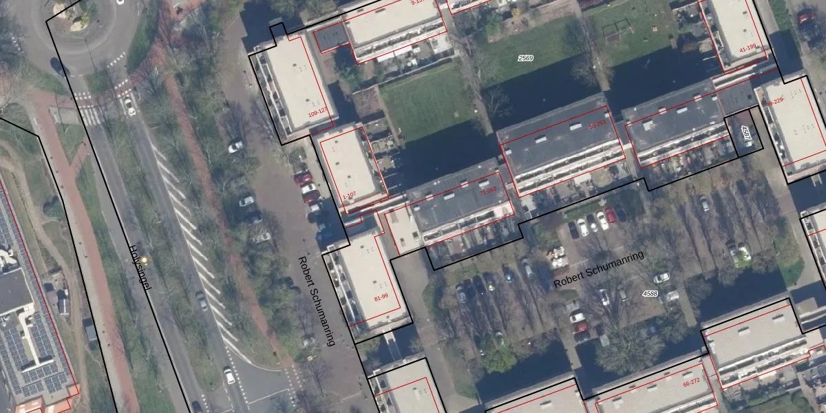 Het perceel waarop Robert Schumanring 79 staat heeft een oppervlakte van 8070 m². Dit is een zeer groot perceel. De perceeloppervlakte wordt geregistreerd door het Kadaster. Gedetailleerde informatie over de maten van dit perceel kunt u vinden in het rapport Kadastrale kaart met maatvoering van Robert Schumanring 79.