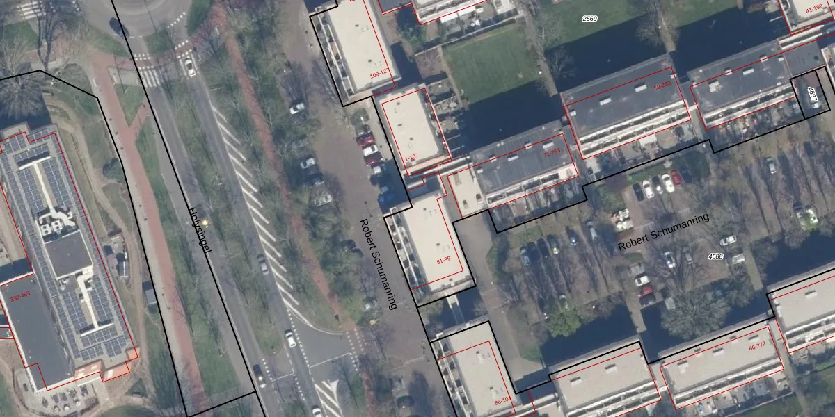Het perceel waarop Robert Schumanring 81 staat heeft een oppervlakte van 8070 m². Dit is een zeer groot perceel. De perceeloppervlakte wordt geregistreerd door het Kadaster. Gedetailleerde informatie over de maten van dit perceel kunt u vinden in het rapport Kadastrale kaart met maatvoering van Robert Schumanring 81.