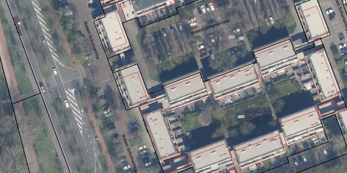 Het perceel waarop Robert Schumanring 84 staat heeft een oppervlakte van 7710 m². Dit is een zeer groot perceel. De perceeloppervlakte wordt geregistreerd door het Kadaster. Gedetailleerde informatie over de maten van dit perceel kunt u vinden in het rapport Kadastrale kaart met maatvoering van Robert Schumanring 84.