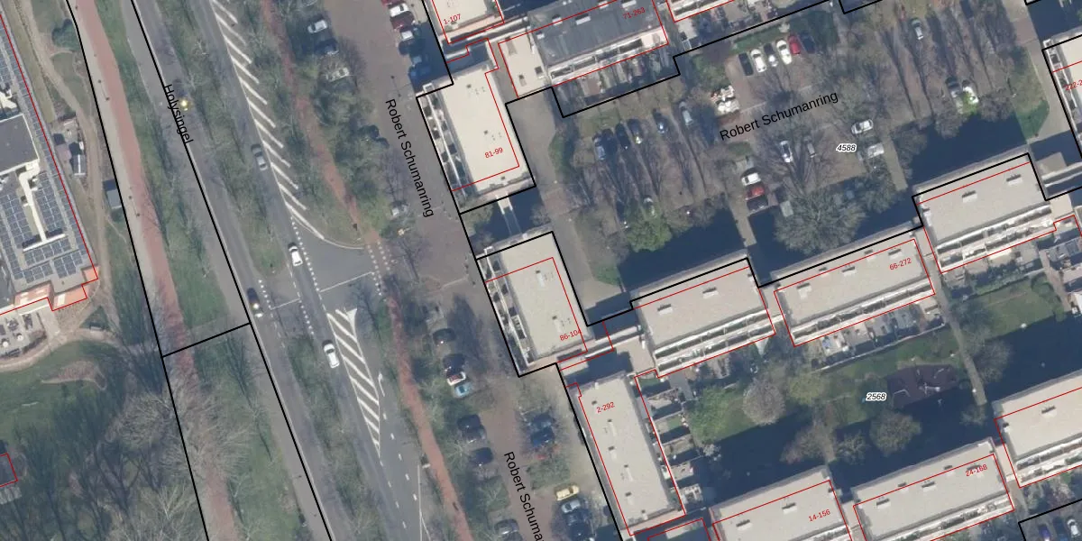 Het perceel waarop Robert Schumanring 98 staat heeft een oppervlakte van 7710 m². Dit is een zeer groot perceel. De perceeloppervlakte wordt geregistreerd door het Kadaster. Gedetailleerde informatie over de maten van dit perceel kunt u vinden in het rapport Kadastrale kaart met maatvoering van Robert Schumanring 98.