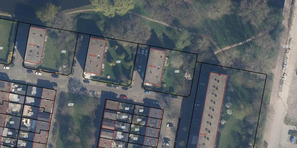 Het perceel waarop Roemer Visscherstraat 200 staat heeft een oppervlakte van 963 m². Dit is een groot perceel. De perceeloppervlakte wordt geregistreerd door het Kadaster. Gedetailleerde informatie over de maten van dit perceel kunt u vinden in het rapport Kadastrale kaart met maatvoering van Roemer Visscherstraat 200.