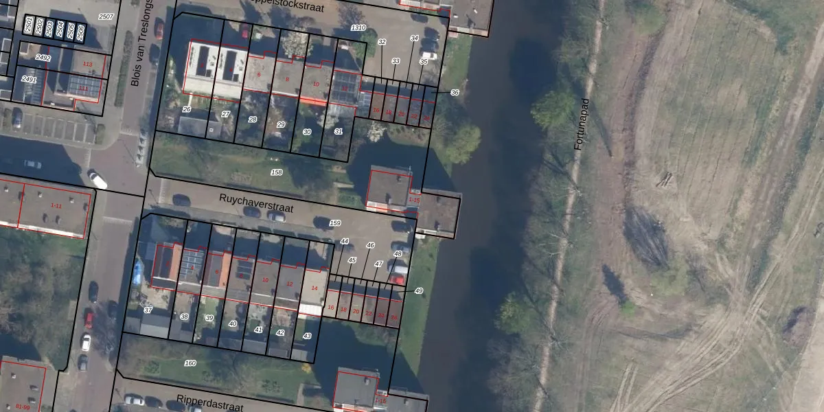 Het perceel waarop Ruychaverstraat 13 staat heeft een oppervlakte van 1037 m². Dit is een zeer groot perceel. De perceeloppervlakte wordt geregistreerd door het Kadaster. Gedetailleerde informatie over de maten van dit perceel kunt u vinden in het rapport Kadastrale kaart met maatvoering van Ruychaverstraat 13.