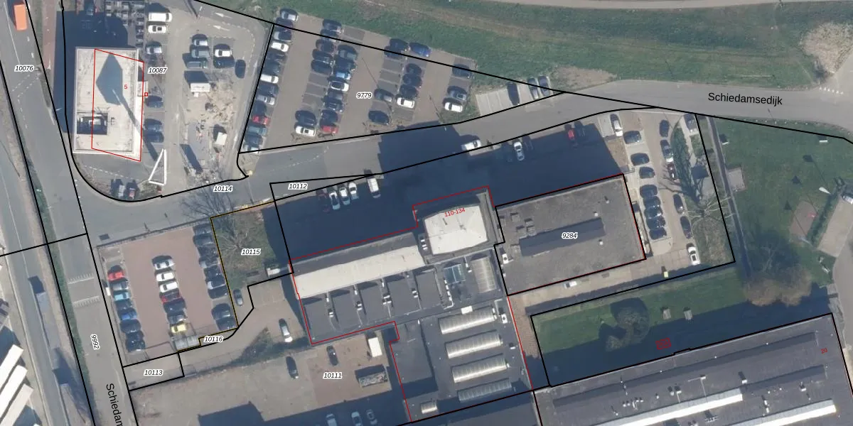 Het perceel waarop Schiedamsedijk 116 staat heeft een oppervlakte van 5735 m². Dit is een zeer groot perceel. De perceeloppervlakte wordt geregistreerd door het Kadaster. Gedetailleerde informatie over de maten van dit perceel kunt u vinden in het rapport Kadastrale kaart met maatvoering van Schiedamsedijk 116.