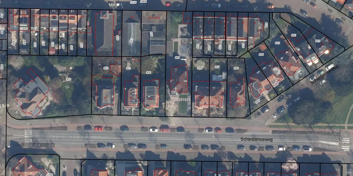 Het perceel waarop Schiedamseweg 103 staat heeft een oppervlakte van 904 m². Dit is een groot perceel. De perceeloppervlakte wordt geregistreerd door het Kadaster. Gedetailleerde informatie over de maten van dit perceel kunt u vinden in het rapport Kadastrale kaart met maatvoering van Schiedamseweg 103.