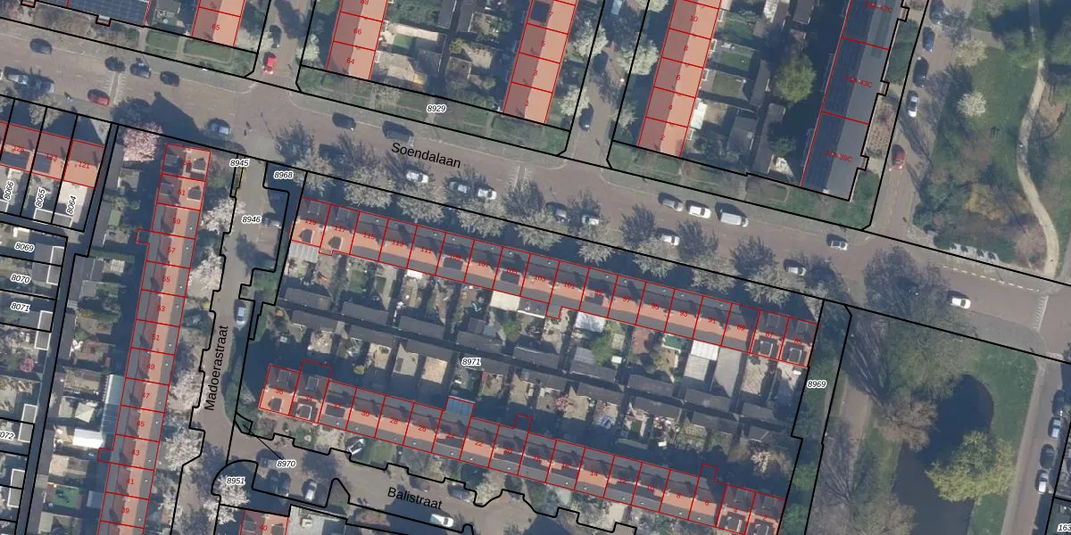 Soendalaan 103 is gelegen op kadastraal perceel VDG00D8971. Deze kadastrale aanduiding is uniek en wordt gebruikt door het Kadaster om eigendomsrechten en andere zakelijke rechten vast te leggen. Het perceel maakt onderdeel uit van de kadastrale gemeente Vlaardingen.