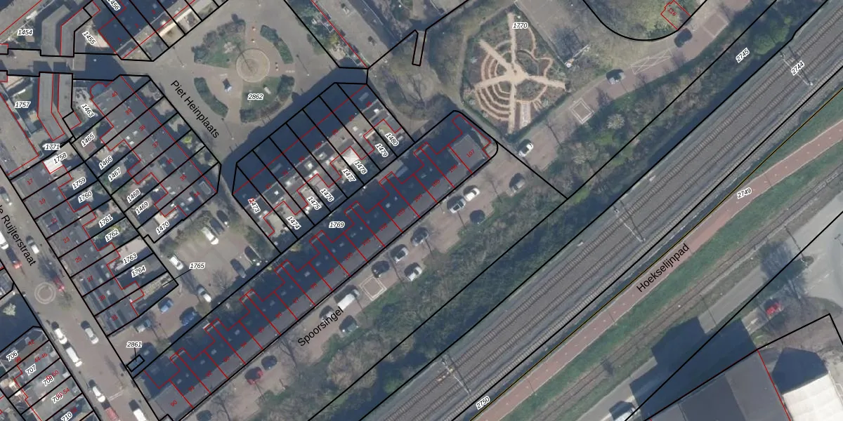 Het perceel waarop Spoorsingel 104 staat heeft een oppervlakte van 1500 m². Dit is een zeer groot perceel. De perceeloppervlakte wordt geregistreerd door het Kadaster. Gedetailleerde informatie over de maten van dit perceel kunt u vinden in het rapport Kadastrale kaart met maatvoering van Spoorsingel 104.