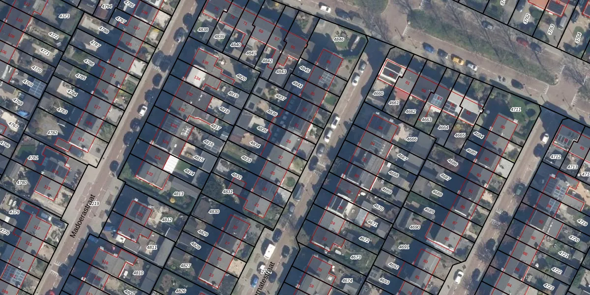 Het perceel waarop Ternatestraat 29 staat heeft een oppervlakte van 165 m². Dit is een middelgroot perceel. De perceeloppervlakte wordt geregistreerd door het Kadaster. Gedetailleerde informatie over de maten van dit perceel kunt u vinden in het rapport Kadastrale kaart met maatvoering van Ternatestraat 29.