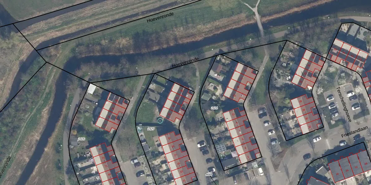 Het perceel waarop Terschellinghoeve 39 staat heeft een oppervlakte van 1370 m². Dit is een zeer groot perceel. De perceeloppervlakte wordt geregistreerd door het Kadaster. Gedetailleerde informatie over de maten van dit perceel kunt u vinden in het rapport Kadastrale kaart met maatvoering van Terschellinghoeve 39.