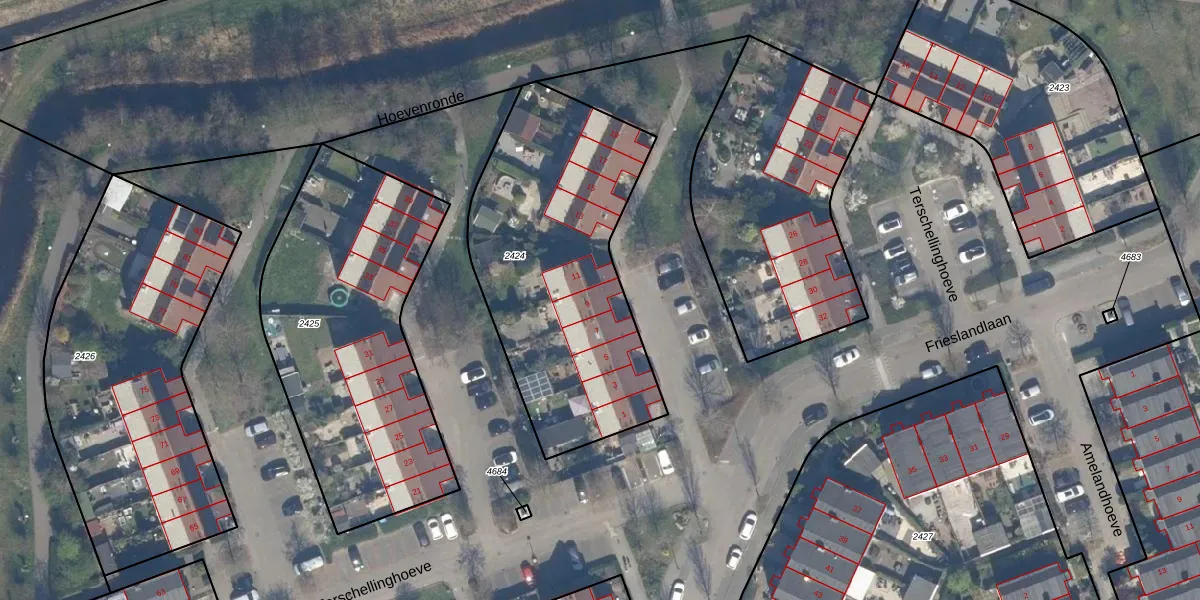 Het perceel waarop Terschellinghoeve 9 staat heeft een oppervlakte van 1340 m². Dit is een zeer groot perceel. De perceeloppervlakte wordt geregistreerd door het Kadaster. Gedetailleerde informatie over de maten van dit perceel kunt u vinden in het rapport Kadastrale kaart met maatvoering van Terschellinghoeve 9.