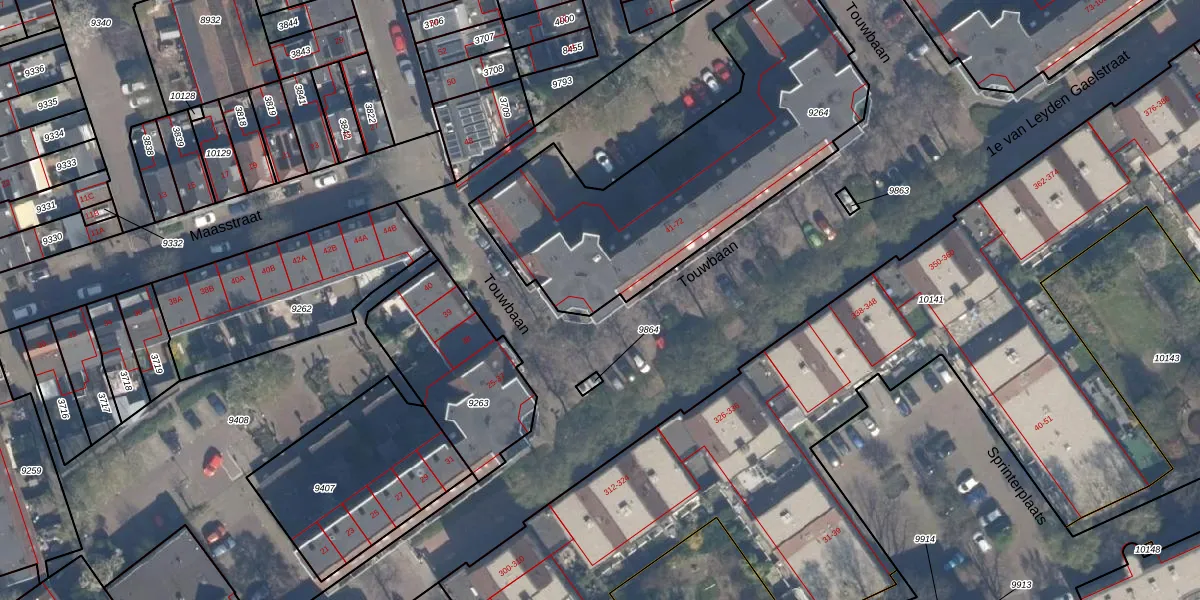 Touwbaan 45 is gelegen op kadastraal perceel VDG00B9264. Deze kadastrale aanduiding is uniek en wordt gebruikt door het Kadaster om eigendomsrechten en andere zakelijke rechten vast te leggen. Het perceel maakt onderdeel uit van de kadastrale gemeente Vlaardingen.