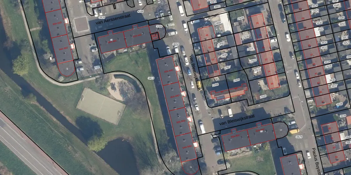 Het perceel waarop van Bleiswijkstraat 46-C staat heeft een oppervlakte van 2453 m². Dit is een zeer groot perceel. De perceeloppervlakte wordt geregistreerd door het Kadaster. Gedetailleerde informatie over de maten van dit perceel kunt u vinden in het rapport Kadastrale kaart met maatvoering van van Bleiswijkstraat 46-C.