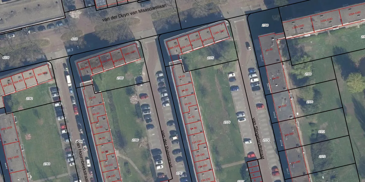 van der Palmstraat 3-B is gelegen op kadastraal perceel VDG00G2776. Deze kadastrale aanduiding is uniek en wordt gebruikt door het Kadaster om eigendomsrechten en andere zakelijke rechten vast te leggen. Het perceel maakt onderdeel uit van de kadastrale gemeente Vlaardingen.
