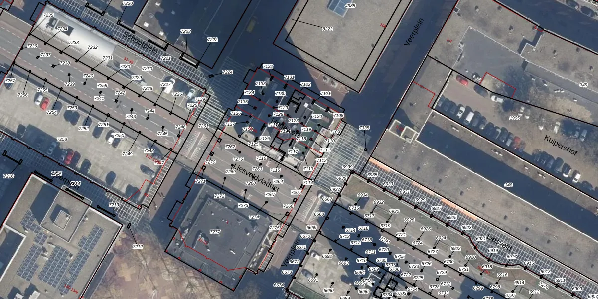 Het perceel waarop Veerplein 36 staat heeft een oppervlakte van 881 m². Dit is een groot perceel. De perceeloppervlakte wordt geregistreerd door het Kadaster. Gedetailleerde informatie over de maten van dit perceel kunt u vinden in het rapport Kadastrale kaart met maatvoering van Veerplein 36.