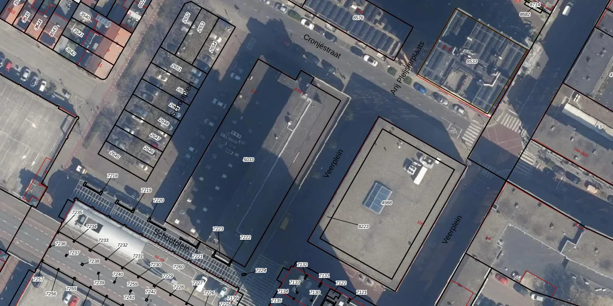 Het perceel waarop Veerplein 6 staat heeft een oppervlakte van 1872 m². Dit is een zeer groot perceel. De perceeloppervlakte wordt geregistreerd door het Kadaster. Gedetailleerde informatie over de maten van dit perceel kunt u vinden in het rapport Kadastrale kaart met maatvoering van Veerplein 6.