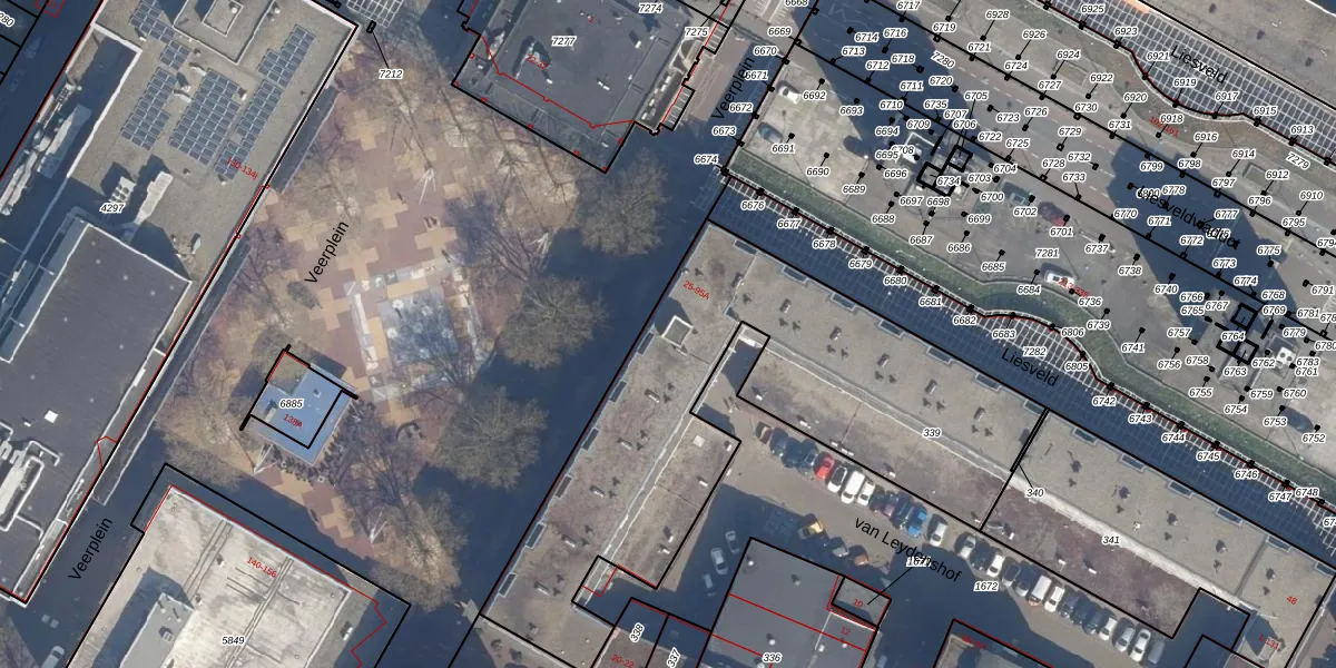 Het perceel waarop Veerplein 65 staat heeft een oppervlakte van 2020 m². Dit is een zeer groot perceel. De perceeloppervlakte wordt geregistreerd door het Kadaster. Gedetailleerde informatie over de maten van dit perceel kunt u vinden in het rapport Kadastrale kaart met maatvoering van Veerplein 65.