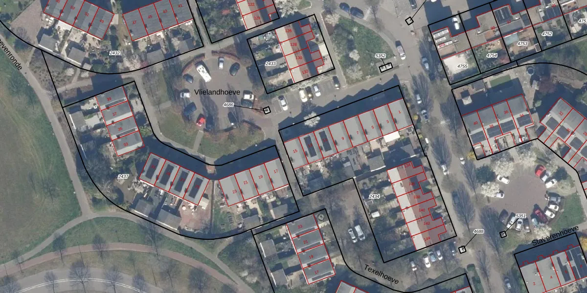 Vlielandhoeve 15 is gelegen op kadastraal perceel VDG00K2434. Deze kadastrale aanduiding is uniek en wordt gebruikt door het Kadaster om eigendomsrechten en andere zakelijke rechten vast te leggen. Het perceel maakt onderdeel uit van de kadastrale gemeente Vlaardingen.