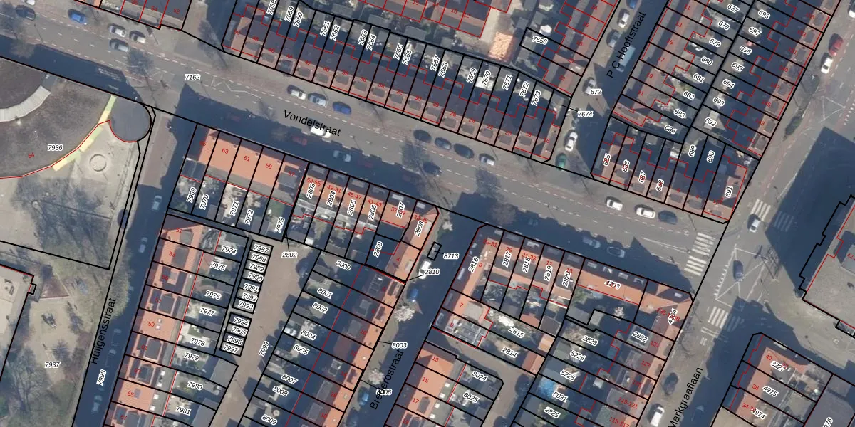 Het perceel waarop Vondelstraat 33 staat heeft een oppervlakte van 57 m². Dit is een klein perceel. De perceeloppervlakte wordt geregistreerd door het Kadaster. Gedetailleerde informatie over de maten van dit perceel kunt u vinden in het rapport Kadastrale kaart met maatvoering van Vondelstraat 33.