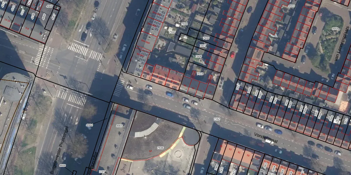 Het perceel waarop Vondelstraat 60 staat heeft een oppervlakte van 4950 m². Dit is een zeer groot perceel. De perceeloppervlakte wordt geregistreerd door het Kadaster. Gedetailleerde informatie over de maten van dit perceel kunt u vinden in het rapport Kadastrale kaart met maatvoering van Vondelstraat 60.