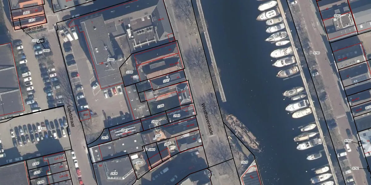 Het perceel waarop Westhavenkade 45 staat heeft een oppervlakte van 310 m². Dit is een groot perceel. De perceeloppervlakte wordt geregistreerd door het Kadaster. Gedetailleerde informatie over de maten van dit perceel kunt u vinden in het rapport Kadastrale kaart met maatvoering van Westhavenkade 45.