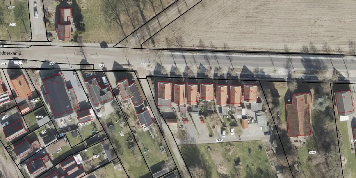 Vledderkamp 14 is gelegen op kadastraal perceel VWD02L2205. Deze kadastrale aanduiding is uniek en wordt gebruikt door het Kadaster om eigendomsrechten en andere zakelijke rechten vast te leggen. Het perceel maakt onderdeel uit van de kadastrale gemeente Vlagtwedde.