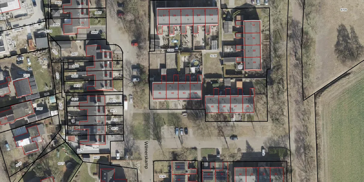 Het perceel waarop Wilmerskamp 43 staat heeft een oppervlakte van 3950 m². Dit is een zeer groot perceel. De perceeloppervlakte wordt geregistreerd door het Kadaster. Gedetailleerde informatie over de maten van dit perceel kunt u vinden in het rapport Kadastrale kaart met maatvoering van Wilmerskamp 43.