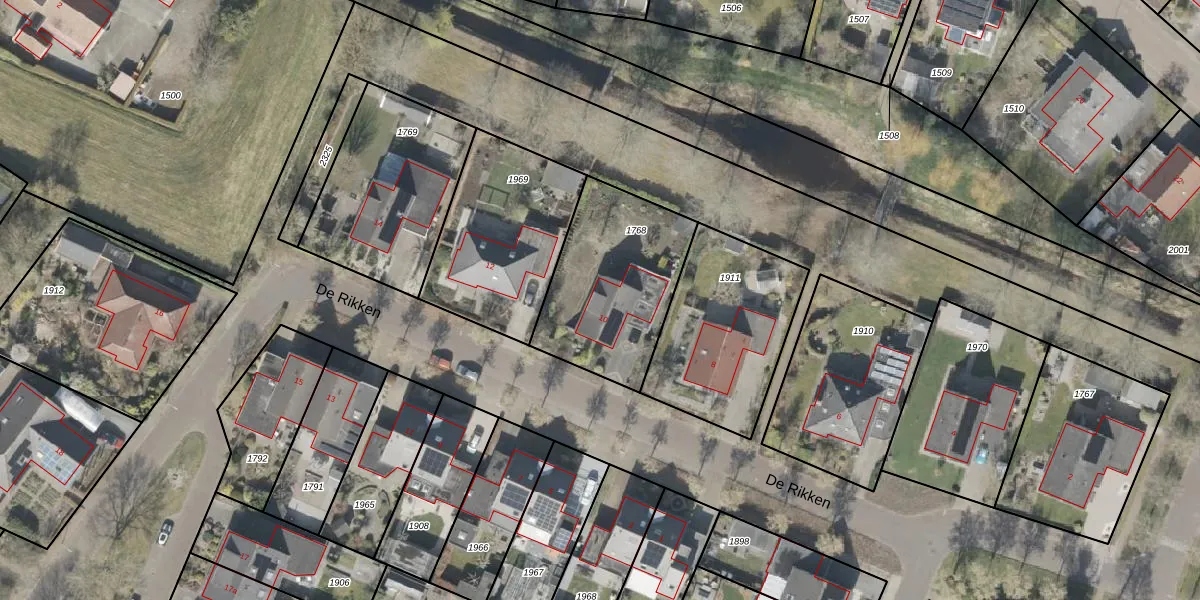 Het perceel waarop De Rikken 10 staat heeft een oppervlakte van 602 m². Dit is een groot perceel. De perceeloppervlakte wordt geregistreerd door het Kadaster. Gedetailleerde informatie over de maten van dit perceel kunt u vinden in het rapport Kadastrale kaart met maatvoering van De Rikken 10.