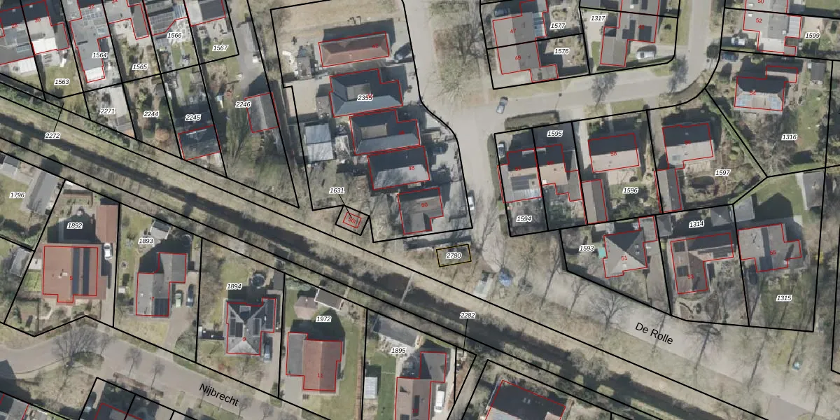 Het perceel waarop De Rolle 50 staat heeft een oppervlakte van 1850 m². Dit is een zeer groot perceel. De perceeloppervlakte wordt geregistreerd door het Kadaster. Gedetailleerde informatie over de maten van dit perceel kunt u vinden in het rapport Kadastrale kaart met maatvoering van De Rolle 50.