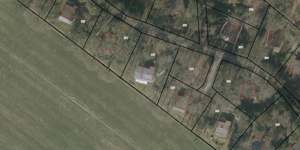De Schure 9 is gelegen op kadastraal perceel VDR00H765. Deze kadastrale aanduiding is uniek en wordt gebruikt door het Kadaster om eigendomsrechten en andere zakelijke rechten vast te leggen. Het perceel maakt onderdeel uit van de kadastrale gemeente Vledder.