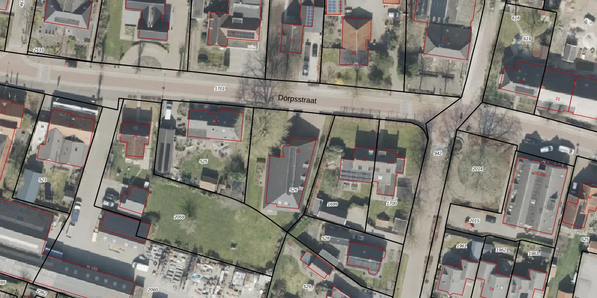 Het perceel waarop Dorpsstraat 20 staat heeft een oppervlakte van 855 m². Dit is een groot perceel. De perceeloppervlakte wordt geregistreerd door het Kadaster. Gedetailleerde informatie over de maten van dit perceel kunt u vinden in het rapport Kadastrale kaart met maatvoering van Dorpsstraat 20.