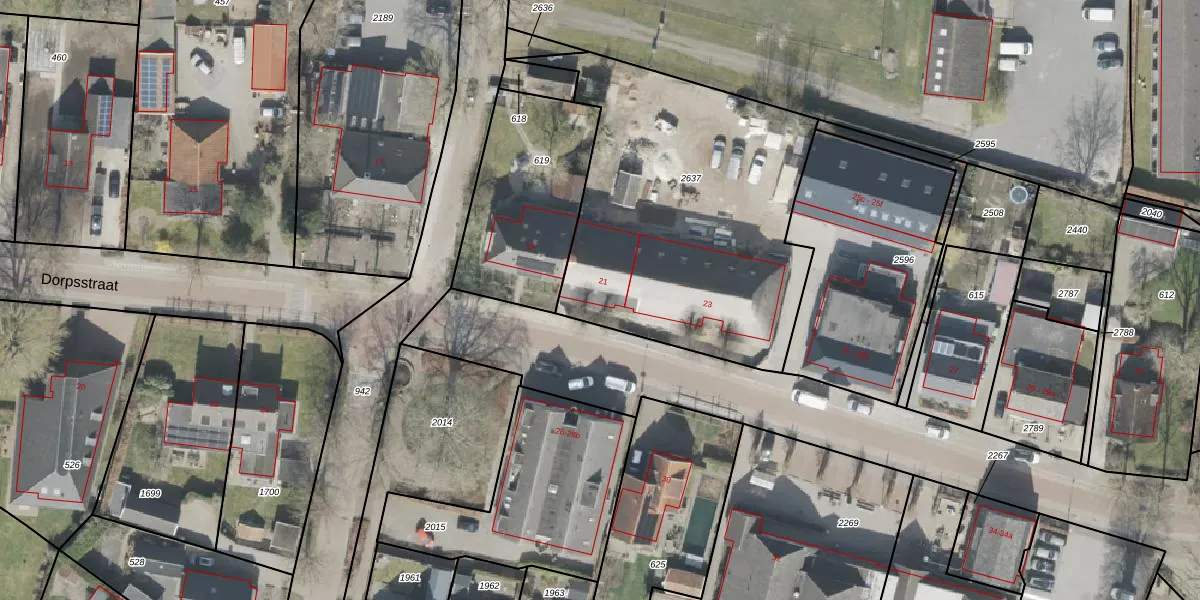 Het perceel waarop Dorpsstraat 21-a staat heeft een oppervlakte van 1673 m². Dit is een zeer groot perceel. De perceeloppervlakte wordt geregistreerd door het Kadaster. Gedetailleerde informatie over de maten van dit perceel kunt u vinden in het rapport Kadastrale kaart met maatvoering van Dorpsstraat 21-a.