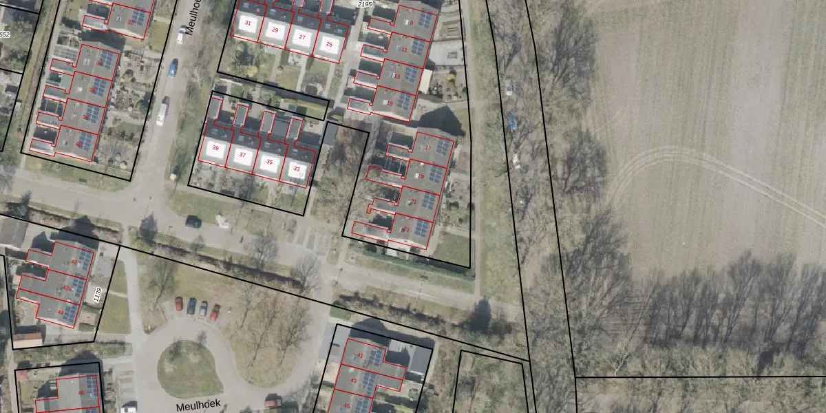 Het perceel waarop Meulhoek 21 staat heeft een oppervlakte van 4021 m². Dit is een zeer groot perceel. De perceeloppervlakte wordt geregistreerd door het Kadaster. Gedetailleerde informatie over de maten van dit perceel kunt u vinden in het rapport Kadastrale kaart met maatvoering van Meulhoek 21.