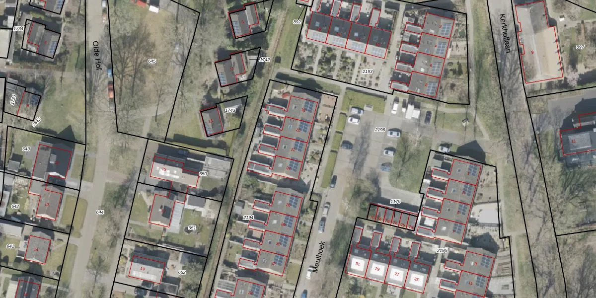 Het perceel waarop Meulhoek 22 staat heeft een oppervlakte van 2544 m². Dit is een zeer groot perceel. De perceeloppervlakte wordt geregistreerd door het Kadaster. Gedetailleerde informatie over de maten van dit perceel kunt u vinden in het rapport Kadastrale kaart met maatvoering van Meulhoek 22.