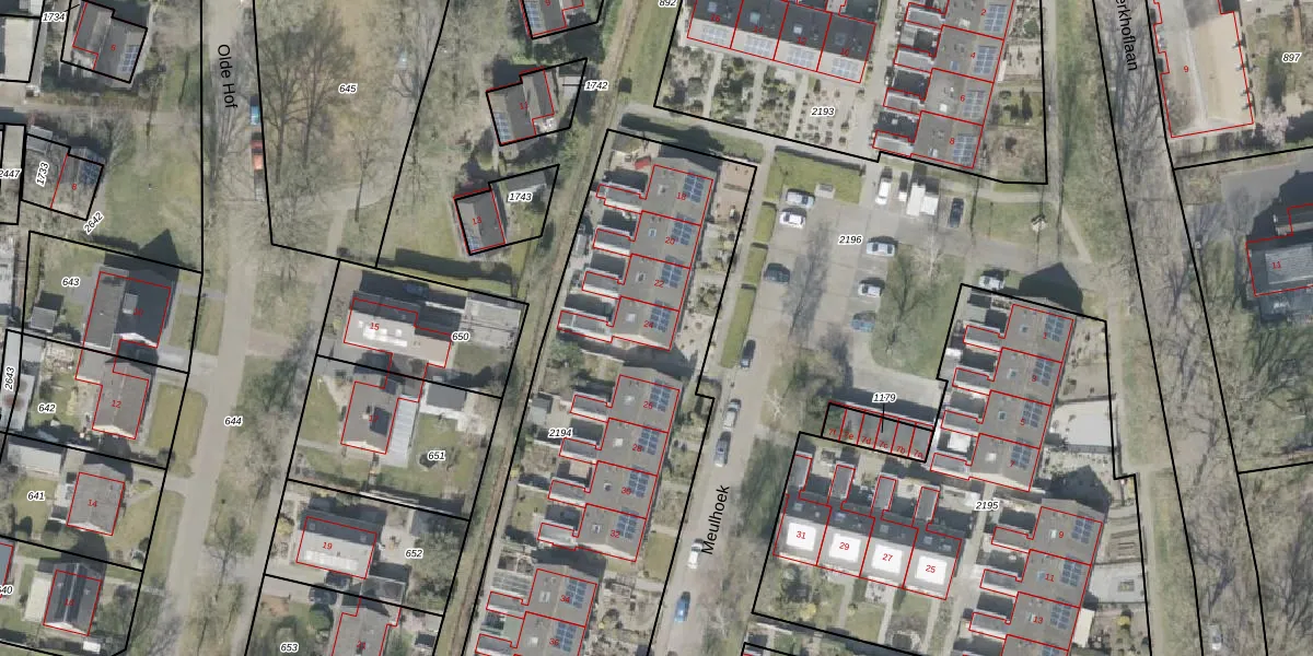 Het perceel waarop Meulhoek 24 staat heeft een oppervlakte van 2544 m². Dit is een zeer groot perceel. De perceeloppervlakte wordt geregistreerd door het Kadaster. Gedetailleerde informatie over de maten van dit perceel kunt u vinden in het rapport Kadastrale kaart met maatvoering van Meulhoek 24.