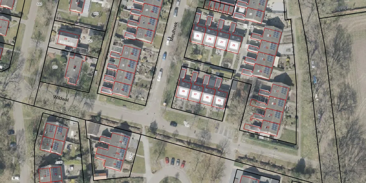 Het perceel waarop Meulhoek 39 staat heeft een oppervlakte van 4021 m². Dit is een zeer groot perceel. De perceeloppervlakte wordt geregistreerd door het Kadaster. Gedetailleerde informatie over de maten van dit perceel kunt u vinden in het rapport Kadastrale kaart met maatvoering van Meulhoek 39.