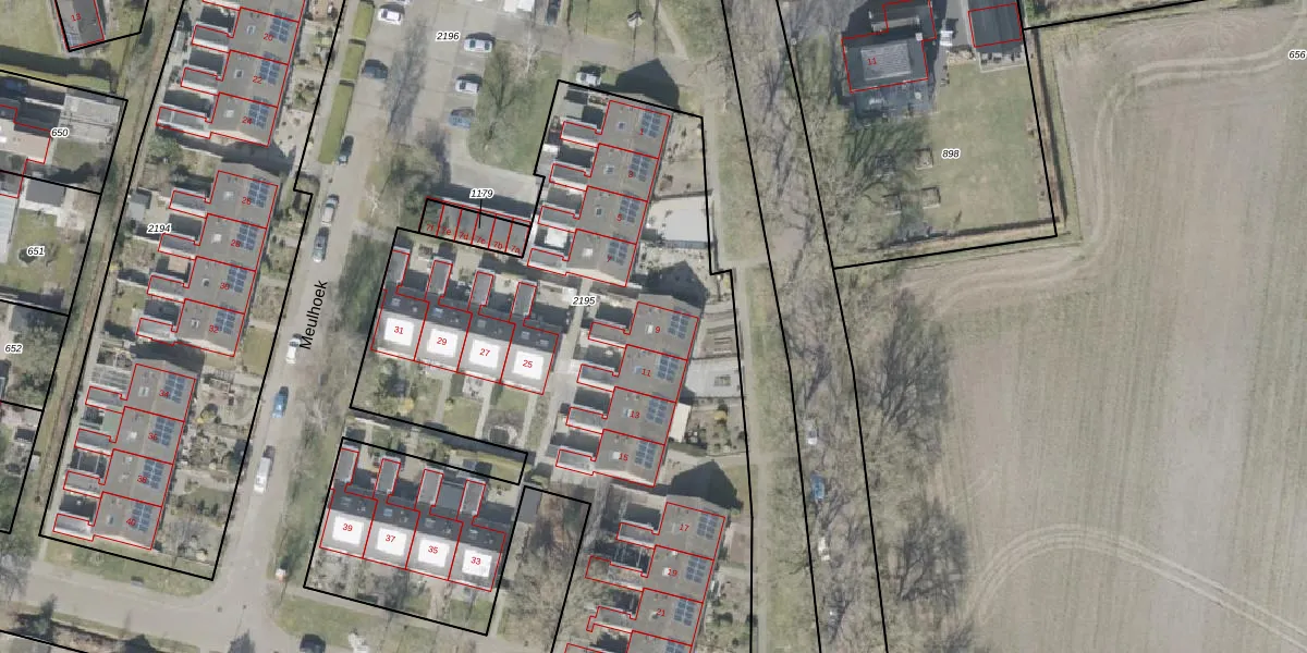 Het perceel waarop Meulhoek 9 staat heeft een oppervlakte van 4021 m². Dit is een zeer groot perceel. De perceeloppervlakte wordt geregistreerd door het Kadaster. Gedetailleerde informatie over de maten van dit perceel kunt u vinden in het rapport Kadastrale kaart met maatvoering van Meulhoek 9.