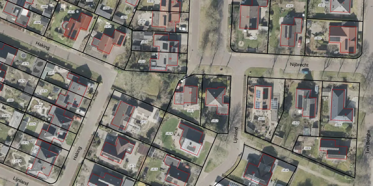 Het perceel waarop Nijbrecht 18 staat heeft een oppervlakte van 361 m². Dit is een groot perceel. De perceeloppervlakte wordt geregistreerd door het Kadaster. Gedetailleerde informatie over de maten van dit perceel kunt u vinden in het rapport Kadastrale kaart met maatvoering van Nijbrecht 18.