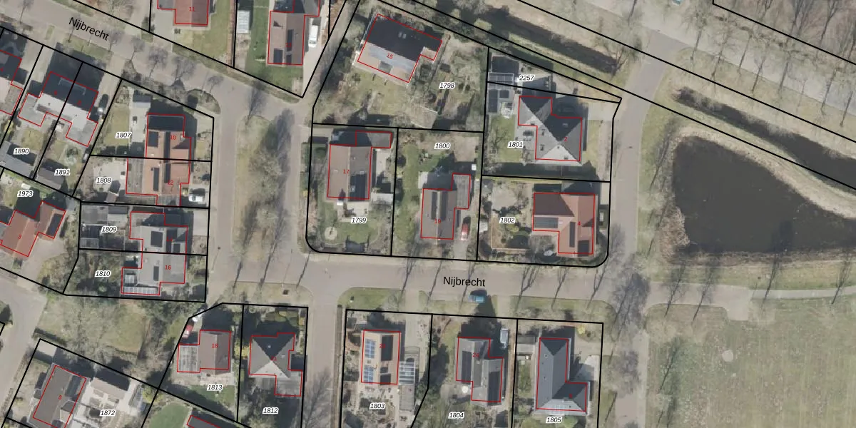 Het perceel waarop Nijbrecht 19 staat heeft een oppervlakte van 605 m². Dit is een groot perceel. De perceeloppervlakte wordt geregistreerd door het Kadaster. Gedetailleerde informatie over de maten van dit perceel kunt u vinden in het rapport Kadastrale kaart met maatvoering van Nijbrecht 19.