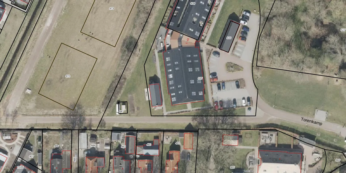 Torenkamp 43 is gelegen op kadastraal perceel VDR00G935. Deze kadastrale aanduiding is uniek en wordt gebruikt door het Kadaster om eigendomsrechten en andere zakelijke rechten vast te leggen. Het perceel maakt onderdeel uit van de kadastrale gemeente Vledder.