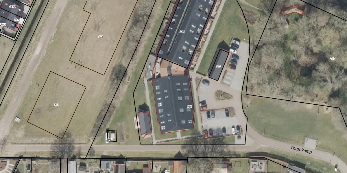 Het perceel waarop Torenkamp 57 staat heeft een oppervlakte van 4105 m². Dit is een zeer groot perceel. De perceeloppervlakte wordt geregistreerd door het Kadaster. Gedetailleerde informatie over de maten van dit perceel kunt u vinden in het rapport Kadastrale kaart met maatvoering van Torenkamp 57.