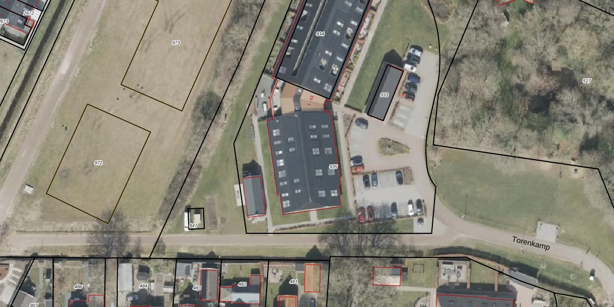 Het adres is gelegen op perceel 935 in de sectie G en de kadastrale gemeente Vledder. De kadastrale aanduiding is aldus VDR00-G-935. Het perceel is kleiner dan gemiddeld in Vledder. Het perceel is 4105 m² groot, terwijl het gemiddelde ligt op 1,2 ha. Het grootste perceel in de kadastrale gemeente is 1,20 km². Het kleinste perceel heeft een oppervlakte van 0 m². Er zijn 17 adressen aanwezig op het perceel. De laatste wijziging in het de Basisregistratie Kadaster (BRK) was op 25-09-2019.