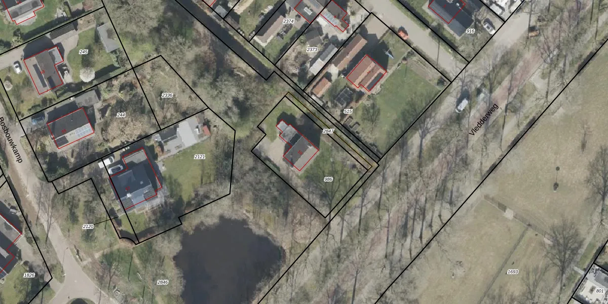 Het adres is gelegen op perceel 986 in de sectie H en de kadastrale gemeente Vledder. De kadastrale aanduiding is aldus VDR00-H-986. De gemiddelde perceelgrootte in Vledder is 1,2 ha. Dit perceel is kleiner: de perceeloppervlakte bedraagt 737 m². Het grootste perceel in de kadastrale gemeente is 1,20 km². Het kleinste perceel heeft een oppervlakte van 0 m². Dit is het enige adres dat aanwezig is op het perceel. De huidige grenzen van het perceel zijn digitaal in de Basisregistratie Kadaster (BRK) geregistreerd op 16-01-2026.