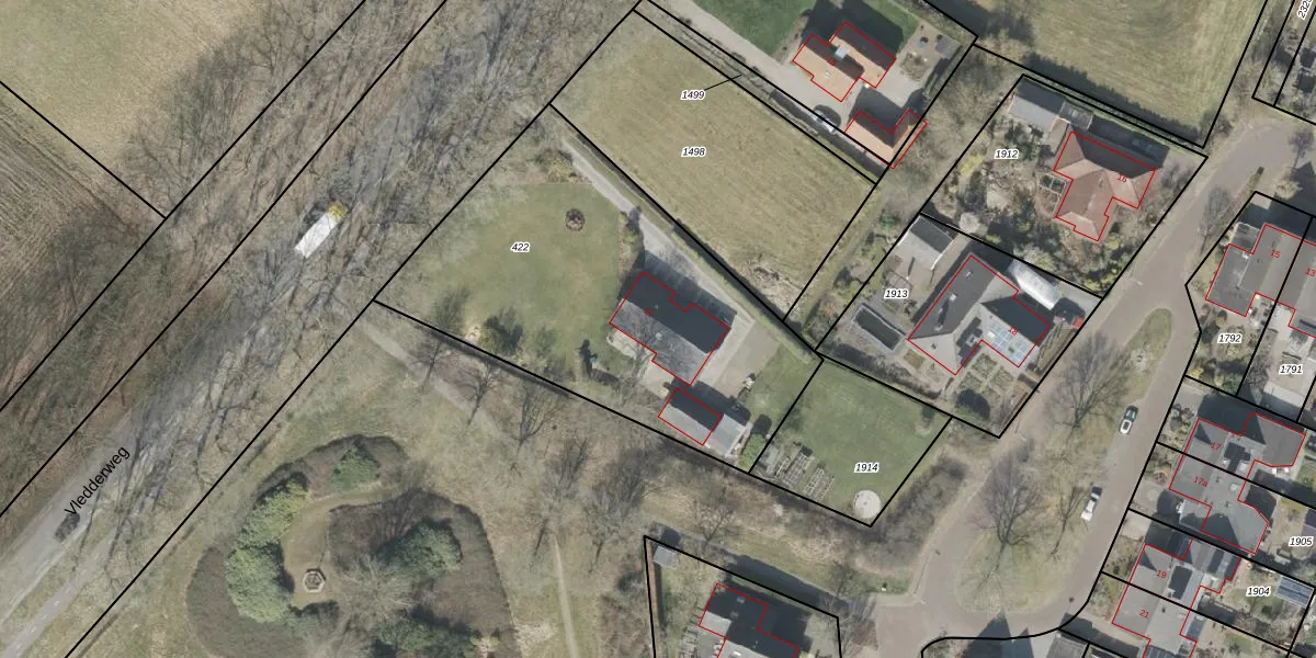 Het perceel waarop Vledderweg 13 staat heeft een oppervlakte van 1790 m². Dit is een zeer groot perceel. De perceeloppervlakte wordt geregistreerd door het Kadaster. Gedetailleerde informatie over de maten van dit perceel kunt u vinden in het rapport Kadastrale kaart met maatvoering van Vledderweg 13.