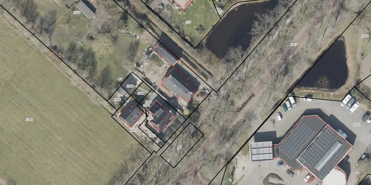 Het perceel waarop Vledderweg 18 staat heeft een oppervlakte van 6473 m². Dit is een zeer groot perceel. De perceeloppervlakte wordt geregistreerd door het Kadaster. Gedetailleerde informatie over de maten van dit perceel kunt u vinden in het rapport Kadastrale kaart met maatvoering van Vledderweg 18.