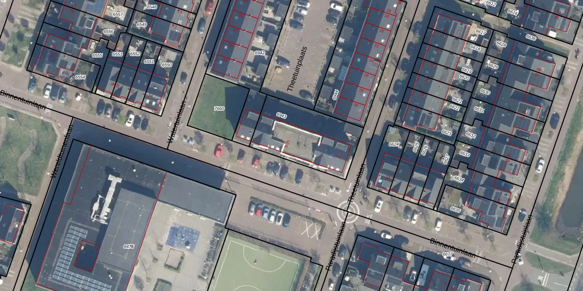Het perceel waarop Binnentuinlaan 13 staat heeft een oppervlakte van 665 m². Dit is een groot perceel. De perceeloppervlakte wordt geregistreerd door het Kadaster. Gedetailleerde informatie over de maten van dit perceel kunt u vinden in het rapport Kadastrale kaart met maatvoering van Binnentuinlaan 13.