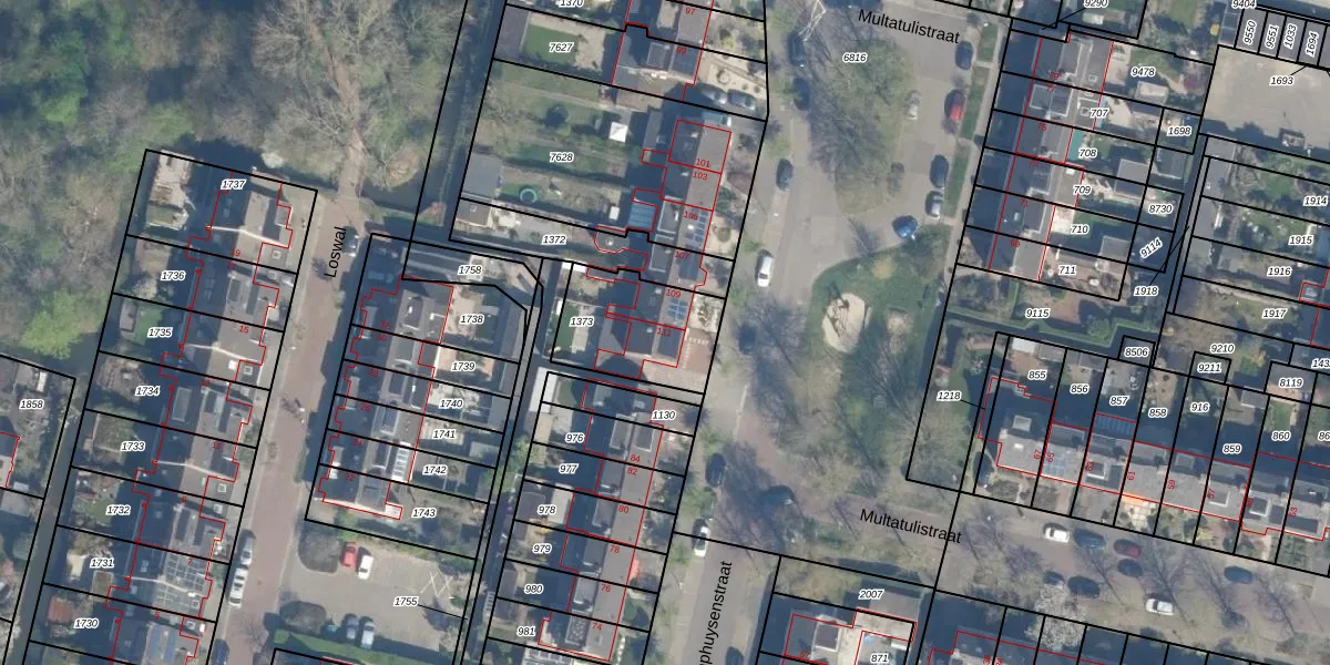Multatulistraat 111 is gelegen op kadastraal perceel VTN00E1373. Deze kadastrale aanduiding is uniek en wordt gebruikt door het Kadaster om eigendomsrechten en andere zakelijke rechten vast te leggen. Het perceel maakt onderdeel uit van de kadastrale gemeente Vleuten.