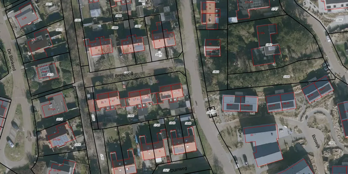 Het perceel waarop Bremweg 1 staat heeft een oppervlakte van 1360 m². Dit is een zeer groot perceel. De perceeloppervlakte wordt geregistreerd door het Kadaster. Gedetailleerde informatie over de maten van dit perceel kunt u vinden in het rapport Kadastrale kaart met maatvoering van Bremweg 1.