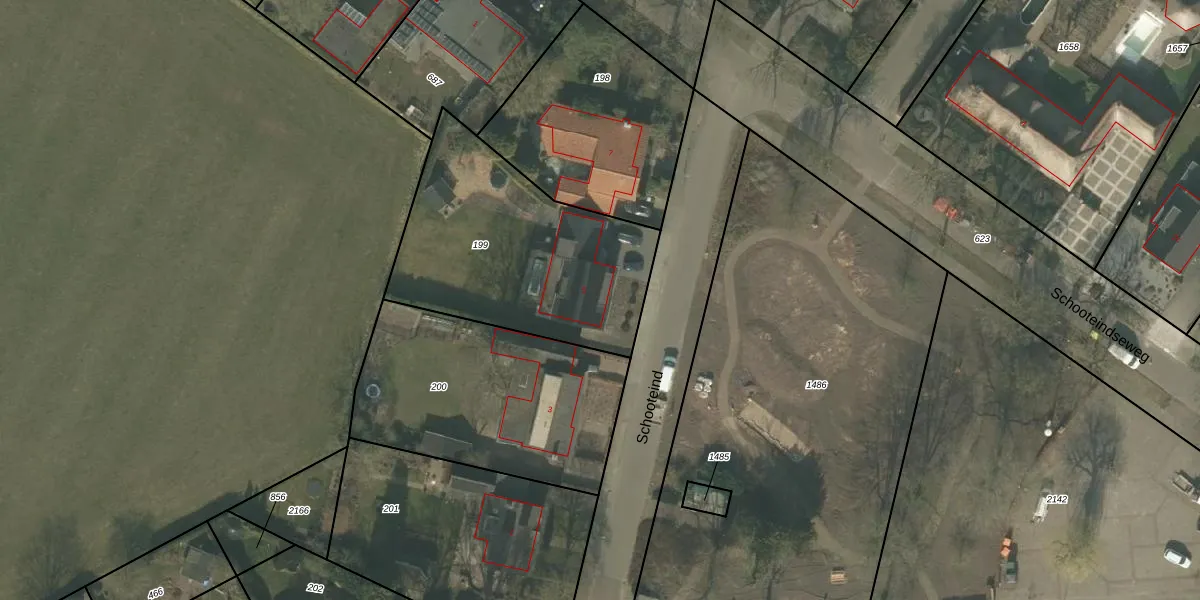 Het perceel waarop Schooteind 5 staat heeft een oppervlakte van 1050 m². Dit is een zeer groot perceel. De perceeloppervlakte wordt geregistreerd door het Kadaster. Gedetailleerde informatie over de maten van dit perceel kunt u vinden in het rapport Kadastrale kaart met maatvoering van Schooteind 5.
