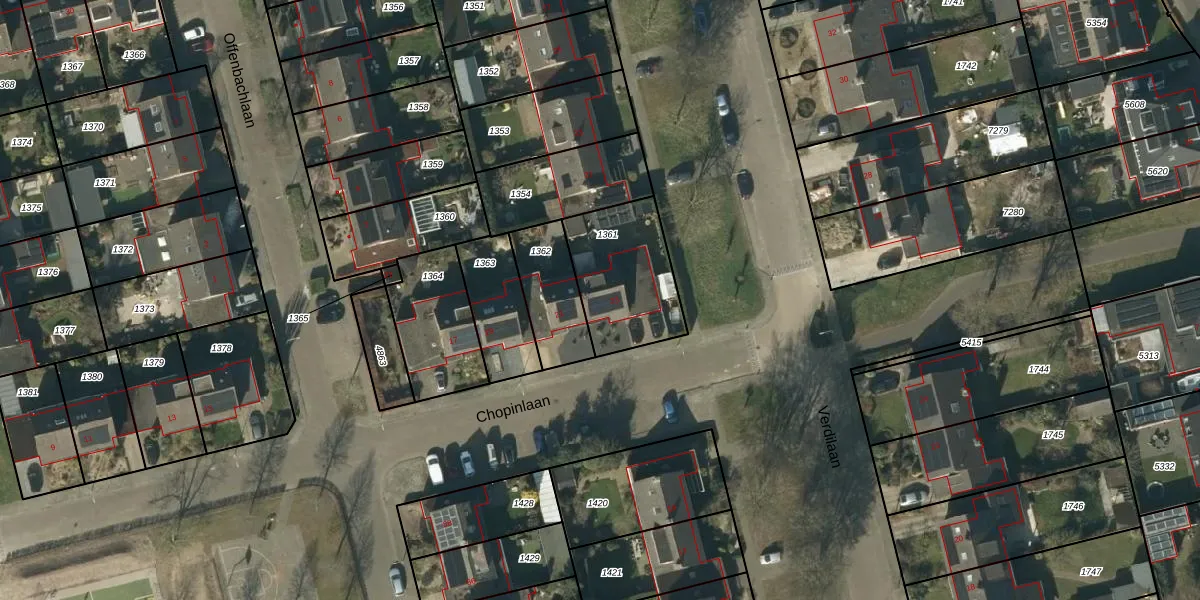 Het perceel waarop Chopinlaan 23 staat heeft een oppervlakte van 375 m². Dit is een groot perceel. De perceeloppervlakte wordt geregistreerd door het Kadaster. Gedetailleerde informatie over de maten van dit perceel kunt u vinden in het rapport Kadastrale kaart met maatvoering van Chopinlaan 23.