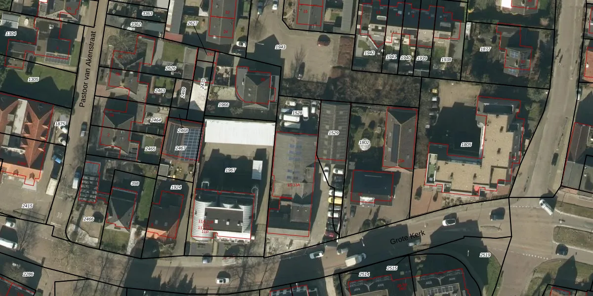 Het perceel waarop Grote Kerk 13-A staat heeft een oppervlakte van 960 m². Dit is een groot perceel. De perceeloppervlakte wordt geregistreerd door het Kadaster. Gedetailleerde informatie over de maten van dit perceel kunt u vinden in het rapport Kadastrale kaart met maatvoering van Grote Kerk 13-A.