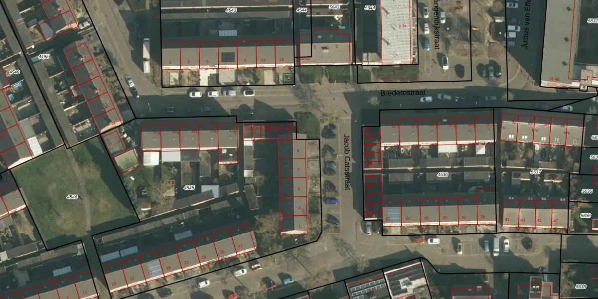 Jacob Catsstraat 9 is gelegen op kadastraal perceel VMN00H4545. Deze kadastrale aanduiding is uniek en wordt gebruikt door het Kadaster om eigendomsrechten en andere zakelijke rechten vast te leggen. Het perceel maakt onderdeel uit van de kadastrale gemeente Vlijmen.